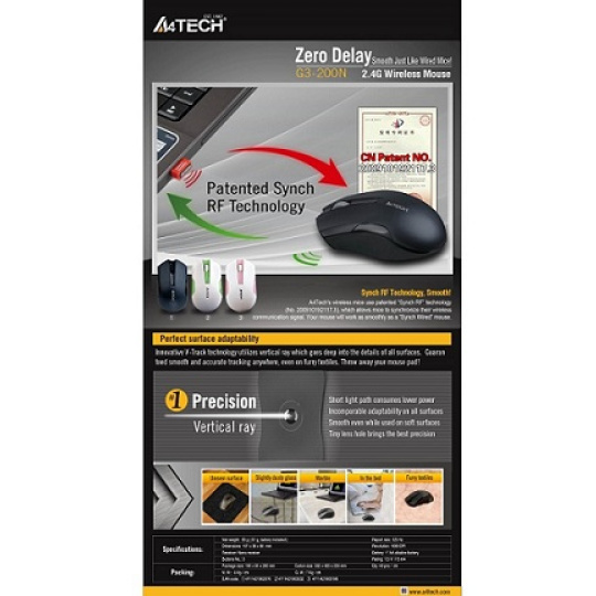 A4tech G3-200N, V-Track, bezdrátová optická myš, 2.4GHz, 10m dosah, černá