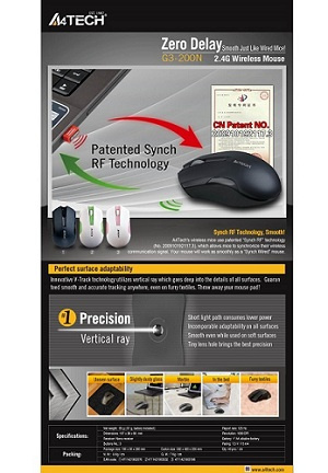 A4tech G3-200N, V-Track, bezdrátová optická myš, 2.4GHz, 10m dosah, černá