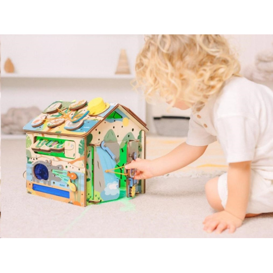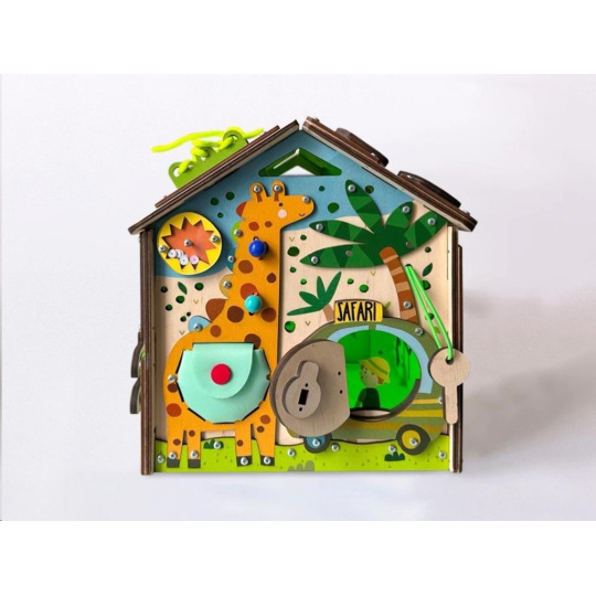 Domeček activity board - Safari je složen ze šesti desek s hracími a montessori prvky zaměřenými na zručnost, logiku, kreativitu a trpělivost. Domeček vtáhne děti do světa objevování a fantazie, kde si děti samy hrají a učí se tím nejpřirozenějším způsobem, pomocí hry.