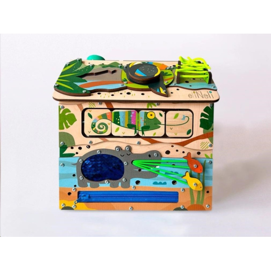 Activity board domeček zavede děti na safari, do divoké přírody s milými zvířátky. Montessori prvky na activity board domečku umožňují dětem všestranně se rozvíjet díky své přirozené zvídavosti.