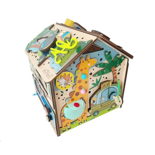 Domeček activity board - Safari je složen ze šesti desek s hracími a montessori prvky zaměřenými na zručnost, logiku, kreativitu a trpělivost. Domeček vtáhne děti do světa objevování a fantazie, kde si děti samy hrají a učí se tím nejpřirozenějším způsobem, pomocí hry.