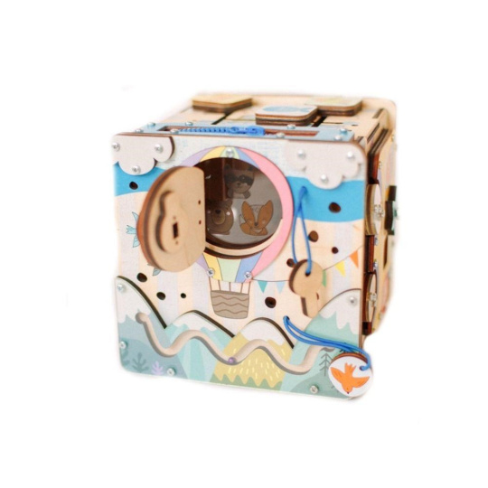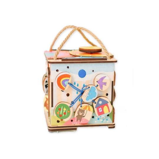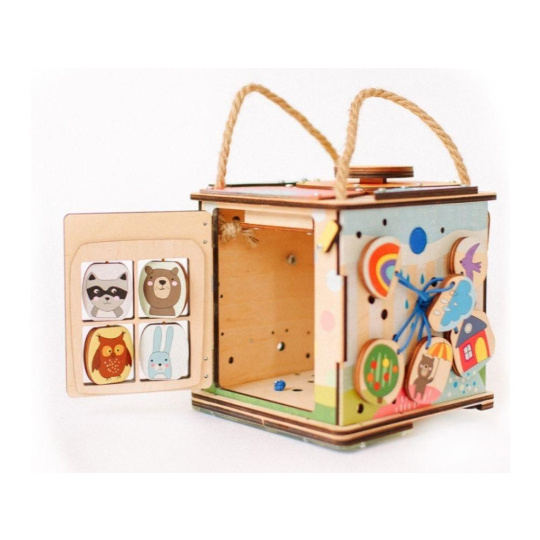 Activity board kostka se zábavnými a montessori prvky nadchne holčičky i kluky. Snadno přenosná kostka si pro děti připravila logické i zábavné hry, které děti zabaví a zdokonalí jejich dovednosti. Každá strana activity board kostky je originální a přináší jiná dobrodružství. Na vrchní straně kostky najdete velký sluníčkový vypínač, s jehož pomocí kostku rozsvítíte. Activity kostka na cesty je montessori hračkou i nočním světýlkem (promítačkou)..