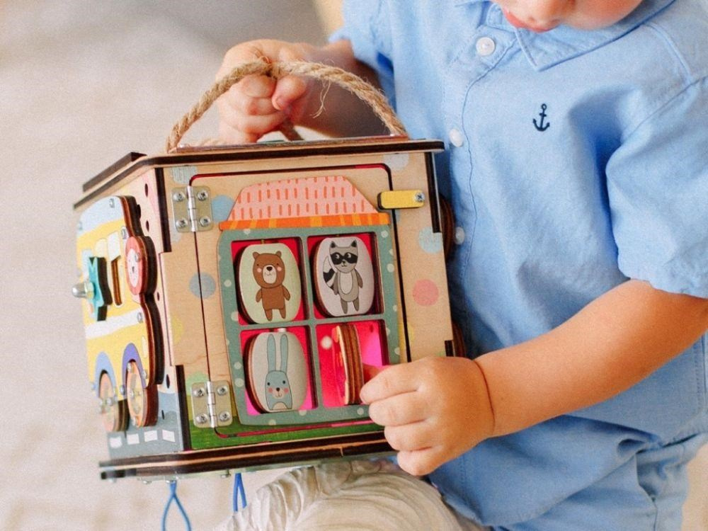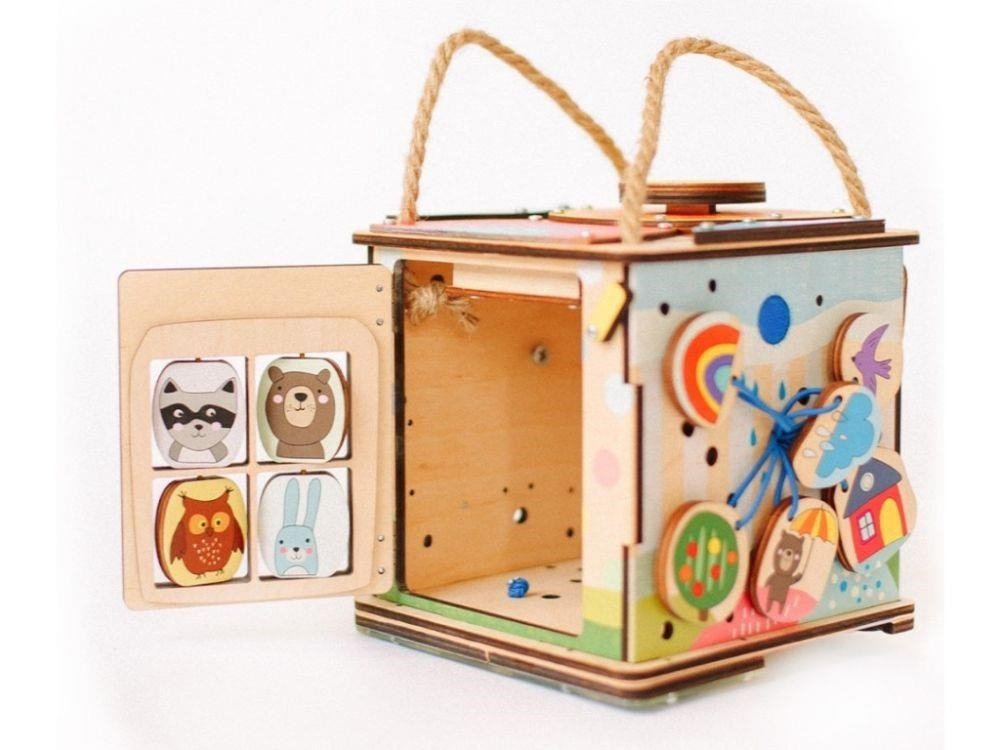 Activity board kostka se zábavnými a montessori prvky nadchne holčičky i kluky. Snadno přenosná kostka si pro děti připravila logické i zábavné hry, které děti zabaví a zdokonalí jejich dovednosti. Každá strana activity board kostky je originální a přináší jiná dobrodružství. Na vrchní straně kostky najdete velký sluníčkový vypínač, s jehož pomocí kostku rozsvítíte. Activity kostka na cesty je montessori hračkou i nočním světýlkem (promítačkou)..