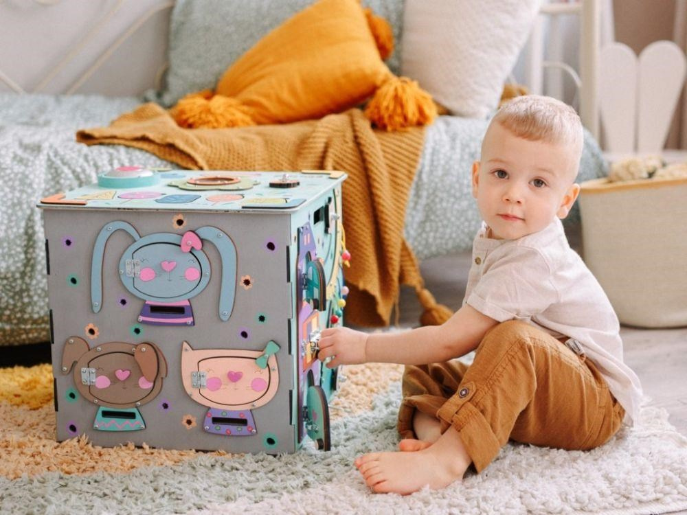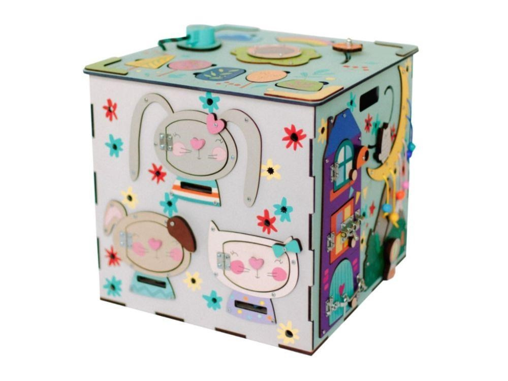 Originální activity board kostka s LED osvětlením XXL je montessori hračkou, která dětem přinese spoustu zábavy, zdokonalí jejich schopnosti a naučí je novým dovednostem. Každá ze stran modrého activity boardu je originální a nabízí nespočet možností ke hře, poznávání a zkoumání. Nechybí ozubená kolečka, různé způsoby zapínání a zavírání, tkanička, bludiště, korálky, vkládací puzzle, různá překvapení i sluníčkový vypínač, který activity board kostku rozzáří..