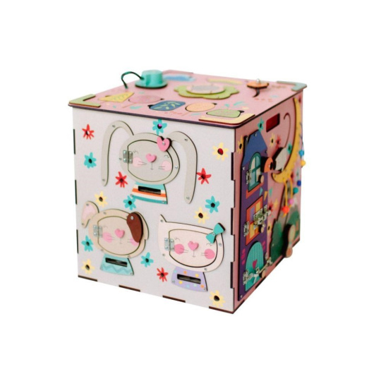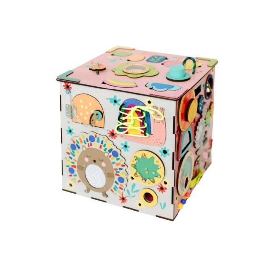 Activity board kostka s LED osvětlením XXL je originální montessori hračkou, která děti zabaví, zdokonalí jejich schopnosti a naučí je novým dovednostem. Každá strana růžového activity boardu je originální a nabízí nespočet možností ke hře, zkoumání a poznávání. Nechybí ozubená kola a kolečka, různé způsoby zapínání, tkanička, různé způsoby zavírání, korálky, bludiště, vkládací puzzle, různá překvapení i sluníčkový vypínač, který activity board kostku rozzáří..