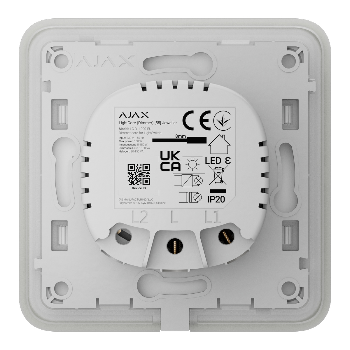 Ajax LightSwitch Dimmer Jeweller je chytrý dotykový nástěnný stmívač pro osvětlení určený pro vnitřní instalaci.