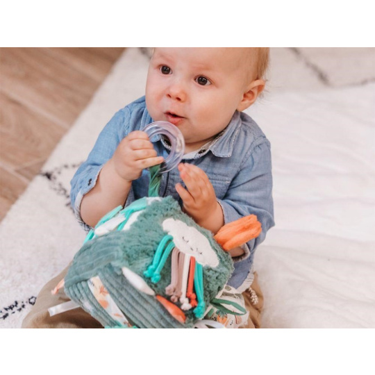 Přestože je lenochod zvířátko, které se pomalu pohybuje a většinu dne prospí, tak tato aktivity kostka lenochod rozhodně vaše miminko lenošit nenechá. Originální prvky v podobě chrastítka, zrcátka, suchých zipů, šustících hodin, tvarů na suchý zip, s provázky, s různými materiály, s kapsičkou a se schovaným lenochodem motivují miminko k pohybu, k prozkoumání, objevování, mačkání, ochutnávání. Při hře se zábavnými prvky na aktivity kostce děti stimulují své smysly, zdokonalují jemnou motoriku i koordinaci očí a rukou. Prohlédněte si tuto úžasně heboučkou kostku s aktivitami, která je skvělým dárkem pro děti již od narození.