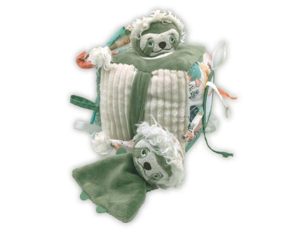 Přestože je lenochod zvířátko, které se pomalu pohybuje a většinu dne prospí, tak tato aktivity kostka lenochod rozhodně vaše miminko lenošit nenechá. Originální prvky v podobě chrastítka, zrcátka, suchých zipů, šustících hodin, tvarů na suchý zip, s provázky, s různými materiály, s kapsičkou a se schovaným lenochodem motivují miminko k pohybu, k prozkoumání, objevování, mačkání, ochutnávání. Při hře se zábavnými prvky na aktivity kostce děti stimulují své smysly, zdokonalují jemnou motoriku i koordinaci očí a rukou. Prohlédněte si tuto úžasně heboučkou kostku s aktivitami, která je skvělým dárkem pro děti již od narození.