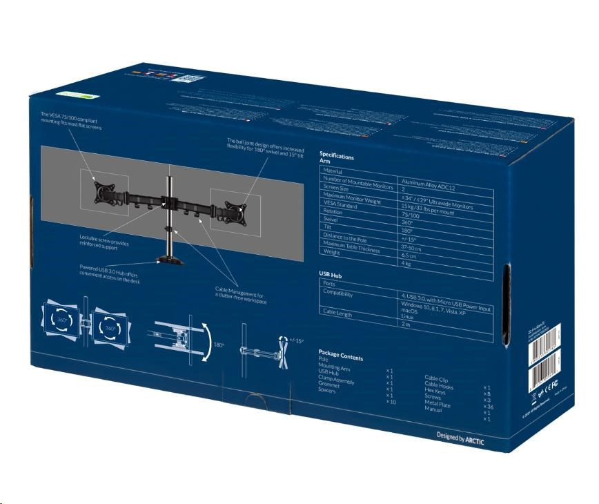 ARCTIC stolní držák Z2 Pro (Gen3) pro 2x LCD do 34", nosnost 2x15kg, 4x USB HUB, černý (black)