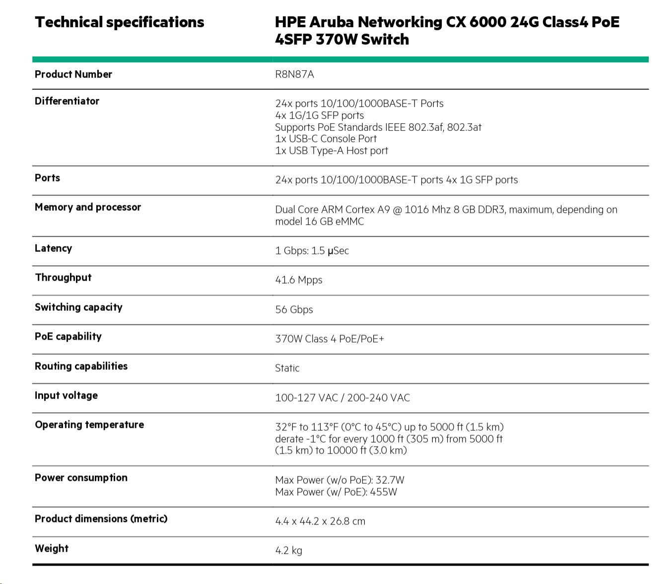 | Aruba 6000 48G Class4 PoE 4SFP 370W Switch (R8N85A) | Aruba 6000 48G 4SFP Switch (R8N86A) | Aruba 6000 24G Class4 PoE 4SFP 370W Switch (R8N87A) | |
