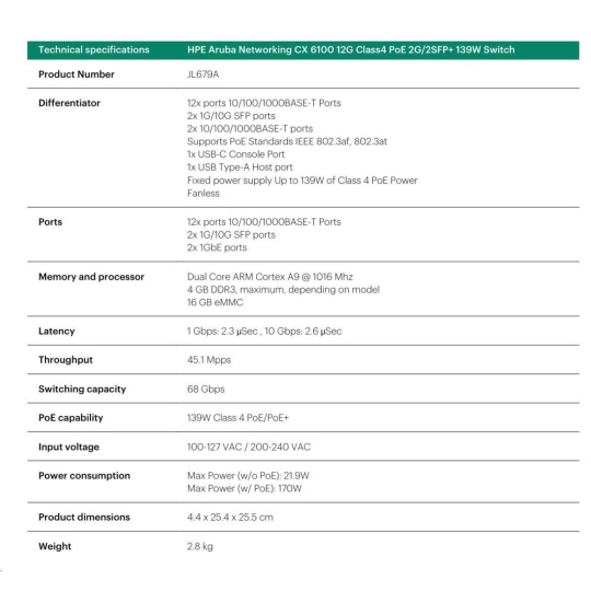 | Aruba 6100 12G Class4 PoE 2G/2SFP+ 139W Switch (JL679A) | |