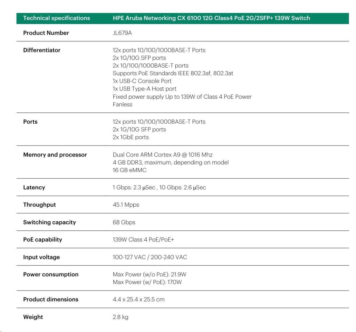 | Power Consumption (230 VAC) | Idle: 16W Max Power (w/o PoE): 21.9W Max Power (w/ PoE): 170W |