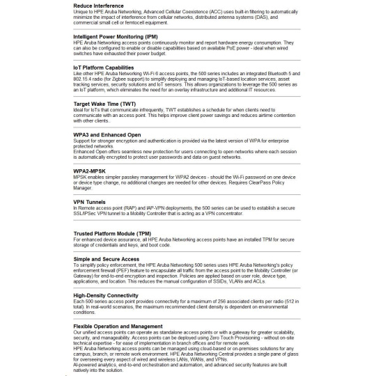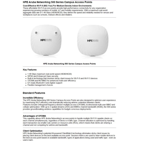The HPE Aruba 500 Series delivers affordable, high-performance Wi-Fi 6 for schools, midsize offices, and retailers. With up to 1.49 Gbps real-world speed, it supports mobile, IoT, and demanding user needs.