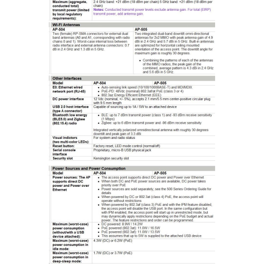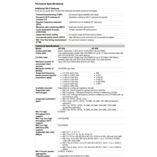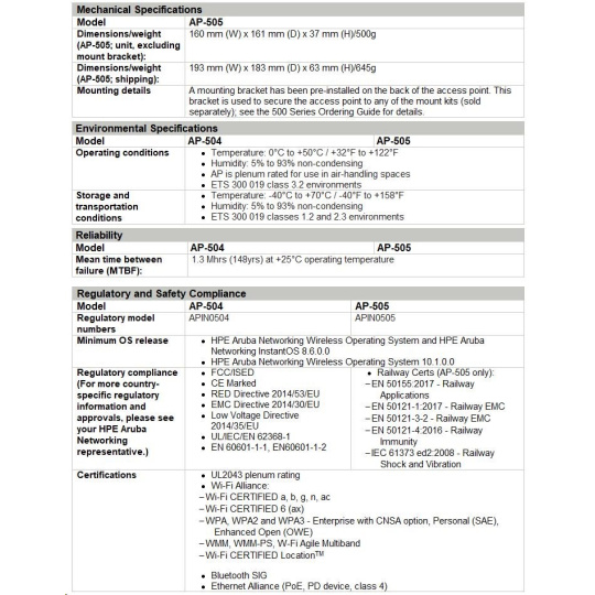 Technical specifications HPE Aruba Networking AP-505 (RW) Dual Radio 2x2 802.11ax Internal Antennas Unified Campus AP Product Number R2H28A Differentiator Available everywhere except US, Israel, Japan and Egypt Certifications UL2043 plenum rating Wi-Fi Alliance: Wi-Fi CERTIFIED a, b, g, n, ac Wi-Fi CERTIFIED 6 (ax) WPA, WPA2 and WPA3-Enterprise with CNSA option, Personal (SAE), Enhanced Open (OWE) WMM, WMM-PS, W-Fi Agile Multiband Wi-Fi CERTIFIED Location™ Bluetooth SIG Ethernet Alliance (PoE, PD device, Class 4) Regulatory FCC/ISED CE Marked RED Directive 2014/53/EU EMC Directive 2014/30/EU Low Voltage Directive 2014/35/EU UL/IEC/EN 62368-1 EN 60601-1-1, EN60601-1-2 Wi-Fi antenna Two integrated dual-band downtilt omni-directional antennas for 2x2 MIMO with peak antenna gain of 4.9dBi in 2.4GHz and 5.7dBi in 5GHz. Connectivity, standard Wi-Fi 6 (IEEE 802.11ax) Ports E0: Ethernet wired network port (RJ-45) USB 2.0 host interface (type A connector) Serial console interface (proprietary, micro-B USB physical jack) Kensington security slot. Mounting See product ordering guide Power consumption Maximum (worst-case) power consumption (without/with a USB device attached): PoE powered (802.3at): 11.0W / 16.5W PoE powered (802.3af): 11.0W / 13.5W This assumes that up to 5W is supplied to the attached USB device Maximum (worst-case) power consumption in idle mode: 4.3W (DC) or 6.2W (PoE) Maximum (worst-case) power consumption in deep-sleep mode: 1.7W (DC) or 3.7W (PoE) Radio coverage AP type: Indoor, dual radio, 5 GHz and 2.4 GHz 802.11ax 2x2 MIMO 5 GHz radio: Two spatial stream Single User (SU) MIMO for up to 1.2 Gbps wireless data rate with 2SS HE80 802.11ax client devices. 2.4 GHz radio: Two spatial stream Single User (SU) MIMO for up to 574 Mbps (287 Mbps) wireless data rate with 2SS HE40 (HE20) 802.11ax client devices. Warranty Limited lifetime warranty. See the warranty duration. Product dimensions (metric) 37 x 160 x 161 mm Weight 500 g