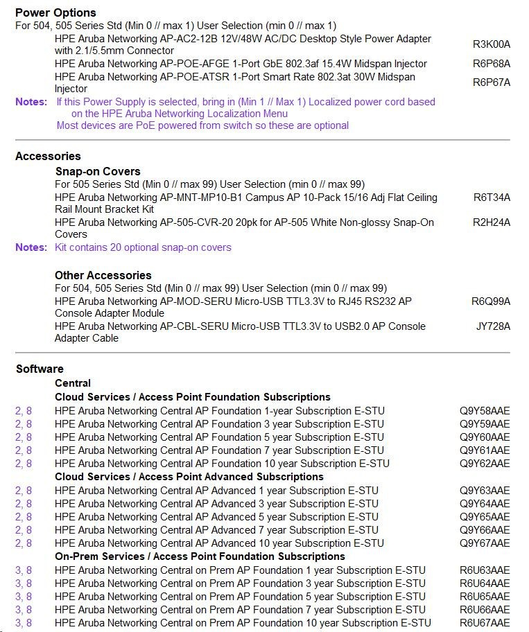 - Management: Aruba Central (cloud) or on-prem controller