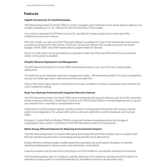 | Aruba Instant On 1830 8G Switch (JL810A) | Aruba Instant On 1830 8G 4p Class4 PoE 65W Switch (JL811A) | Aruba Instant On 1830 24G 2SFP Switch (JL812A) | Aruba Instant On 1830 24G 12p Class4 PoE 2SFP 195W Switch (JL813A) | Aruba Instant On 1830 48G 4SFP Switch (JL814A) | Aruba Instant On 1830 48G 24p Class4 PoE 4SFP 370W Switch (JL815A) | ||||