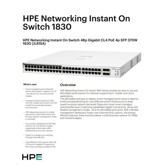 HPE Networking Instant On Switch 48p Gigabit CL4 PoE 4p SFP 370W 1830 (JL815A)