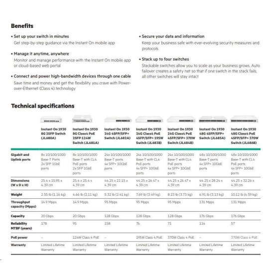 Whether you own a cafe, a design firm or a tech startup, a reliable and secure network plays a critical role in the success of your business. And you need a network solution that gives you peace of mind, allowing you to focus on growing your business instead of managing problems with your network. Aruba Instant On makes it easy to keep network users happy, mobile and IoT devices connected, and your network secure. The Aruba Instant On 1930 switches features advanced, smart-managed, fixed- configuration Gigabit switches designed for small businesses that are easy-to-deploy and affordable. They're made to handle today's bandwidth-heavy applications like voice and video conferencing, enabling consistent connectivity to enhance performance. Using either the Instant On mobile app or the cloud-based web portal, you can quickly set up, monitor and manage the 1930 switch series from anywhere at any time. What's more, up to 30 W PoE power delivery is available out-of-the-box for your class 4 PoE devices, like access points, surveillance cameras and VoIP phones, all easily managed from the same platform. Built-in security features protect your network from unauthorized access by allowing you to segment traffic and define access to each area of the network. And all of this is included in the price of the hardware - there are no hidden subscription or licensing fees.