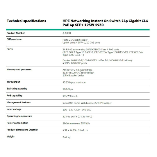 HPE Networking Instant On Switch 24p Gigabit CL4 PoE 4p SFP+ 195W 1930 (JL683B)