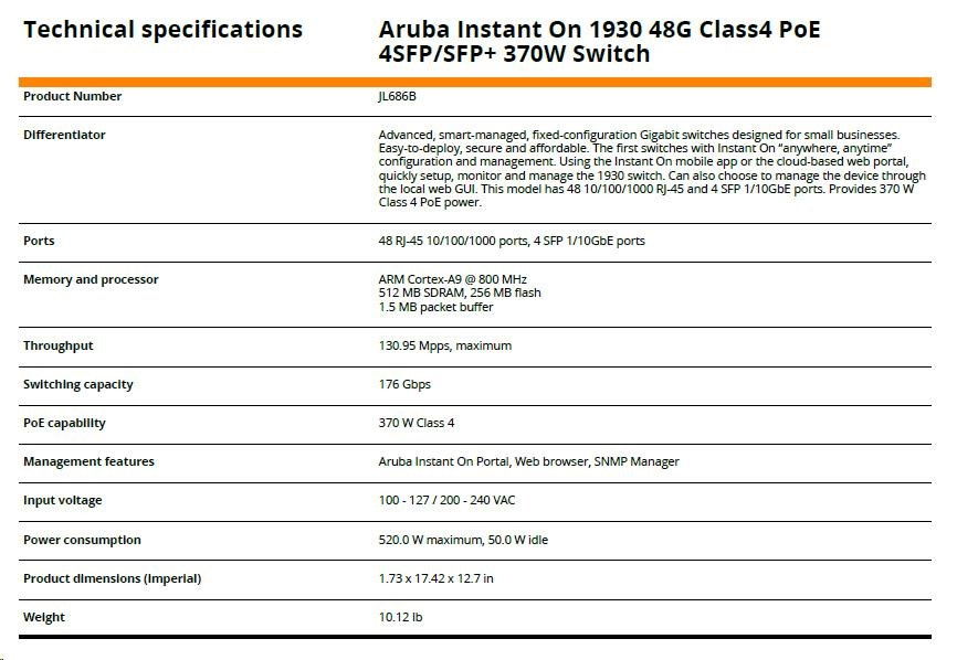 | Aruba Instant On 1930 48G Class4 PoE 4SFP/SFP+ 370W Switch (JL686B) | ||