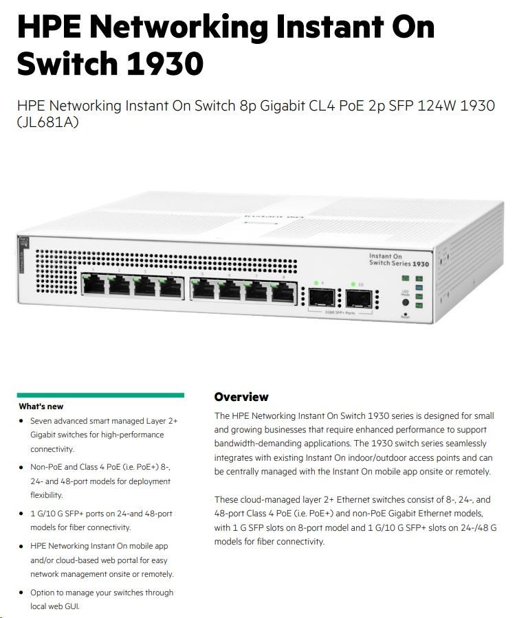 HPE Networking Instant On Switch 8p Gigabit CL4 PoE 2p SFP 124W 1930 (JL681A)