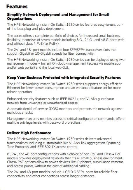 Whether you own a cafe, a design firm or a tech startup, a reliable and secure network plays a critical role in the success of your business. And you need a network solution that gives you peace of mind, allowing you to focus on growing your business instead of managing problems with your network. Aruba Instant On makes it easy to keep network users happy, mobile and IoT devices connected, and your network secure. The Aruba Instant On 1930 switches features advanced, smart-managed, fixed- configuration Gigabit switches designed for small businesses that are easy-to-deploy and affordable. They're made to handle today's bandwidth-heavy applications like voice and video conferencing, enabling consistent connectivity to enhance performance. Using either the Instant On mobile app or the cloud-based web portal, you can quickly set up, monitor and manage the 1930 switch series from anywhere at any time. What's more, up to 30 W PoE power delivery is available out-of-the-box for your class 4 PoE devices, like access points, surveillance cameras and VoIP phones, all easily managed from the same platform. Built-in security features protect your network from unauthorized access by allowing you to segment traffic and define access to each area of the network. And all of this is included in the price of the hardware - there are no hidden subscription or licensing fees.