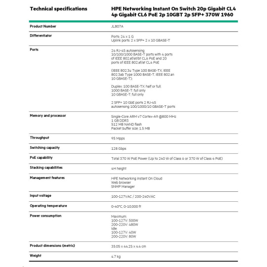 HPE Networking Instant On Switch 20p Gigabit CL4 4p Gigabit CL6 PoE 2p 10GBT 2p SFP+ 370W 1960 (JL807A).