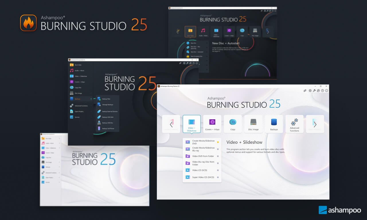 Nové Ashampoo Burning Studio 26 představuje nejpohodlnější způsob bezpečného vypalování dat a kopírování disků CD, DVD a Blu-ray bez námahy. Ripujte audio disky a zálohujte svou hudbu nebo vytvářejte vlastní hudební kompilace s vhodnými obaly! Další špičkové multimediální funkce vám také umožní vytvářet vlastní filmy a prezentace, a dokonce je umožní vypálit na disk spolu s šikovnými animovanými nabídkami. Rozlučte se se ztrátou dat, okamžitě zálohujte své soubory a vypalujte důležitá data na jakýkoli typ disku pomocí výkonné komprese a ochrany heslem. A nové komfortní funkce pro audioknihy, audioprojekce a podcasty jsou zárukou kvalitní zábavy!