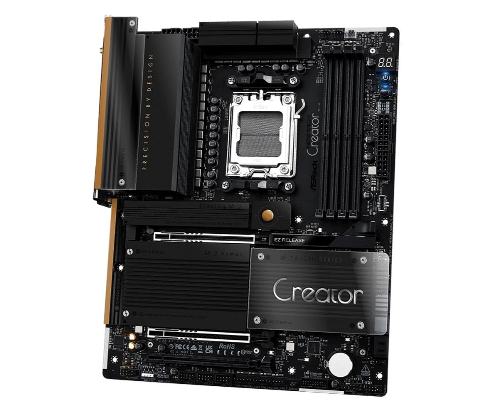 The X870 Taichi Creator features 10GbE and 5GbE LAN, dual USB4 Type-C, dual Gen5 M.2 slots, and dual PCIe 5.0 x16 slots with extra spacing for dual-GPU setups.