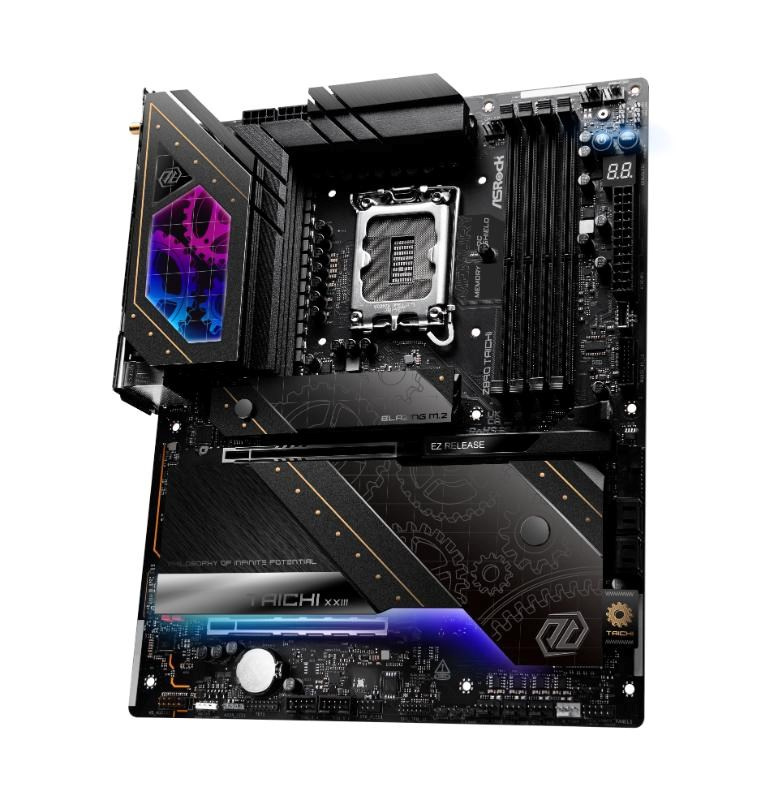 Taichi series flagship motherboard features top-tier hardware spec, robust power design, Thunderbolt™ 4 Type-C, and DIY-friendly functionality. It's built for high-end gamers, offering luxury aesthetics and powerful performance.