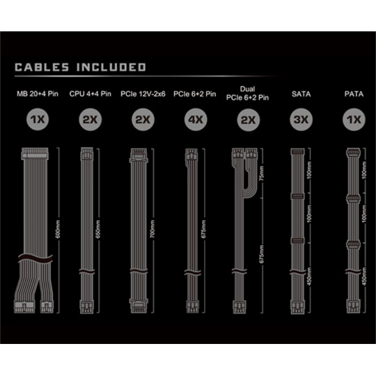 | Dueal PCIe 6+2 Pin Konektor | 2x / 2x (675 + 75 mm) |