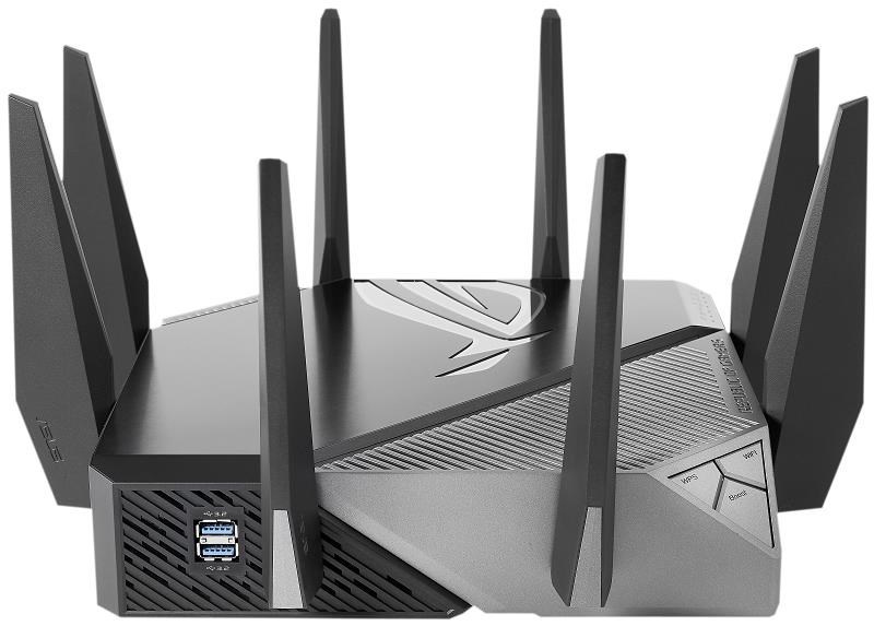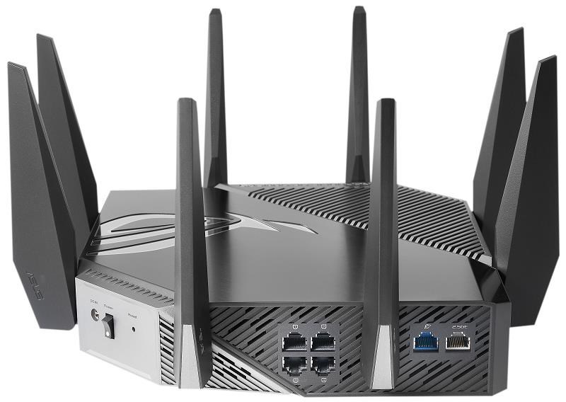 ROG Rapture GT-AXE11000 Třípásmový herní router GT-AXE11000 WiFi 6E (802.11ax), nové pásmo 6 GHz, 2.5G WAN/LAN port, kompatibilní s PS5, agregace WAN, VPN Fusion, tříúrovňová herní akcelerace, zabezpečení sítě zdarma a podpora AiMesh Standard WiFi nové generace – první třípásmový WiFi 6E router na světě zvyšuje rychlost až 11 000 Mb/s. Nové pásmo 6 GHz – Širší kanály a vyšší kapacita přinášejí vyšší výkon, nižší latenci a menší rušení. 2.5G WAN/LAN Port – Veškerý síťový provoz procházející přes 2.5G port má nejvyšší prioritu a 2.5G port tak dokáže plně využít potenciál WiFi 6. Výkon díky dokonalé technice – Čtyřjádrový procesor, pokročilý chladicí systém a optimalizovaný design antény přinášejí výpočetní schopnosti na zcela nové úrovni. Tříúrovňová herní akcelerace – Zrychlete přenos herních dat na každé zastávce, od vašeho zařízení až po herní server. RJ45 for Gigabits BaseT for WAN x 1, RJ45 for Gigabits BaseT for LAN x 4, RJ45 for 2.5G BaseT for WAN/LAN x 1 ROG Rapture Wifi 6 802.11ax Tri-band Gigabit Gaming Router Wifi 6 802.11ax 1148Mbps (2.4G) Wifi 6 802.11ax 4804Mbps (5GHz) Wifi 6E 802.11ax 4804Mbps (6GHz) OFDMA + MU-MIMO tech, 1024 QAM, Triple level Game Acceleration, Aura RGB lighting, ROG Boost Key, 2.5G Multi-Gigabit Gaming Port, WiFI Radar and Zero Wait DFS, AiProtection Pro, VPN Fusion Adaptive QoS, Bandwidth control, AiMesh, ASUS Roter APP (ROG theme).
