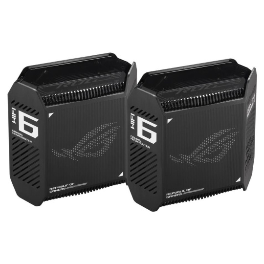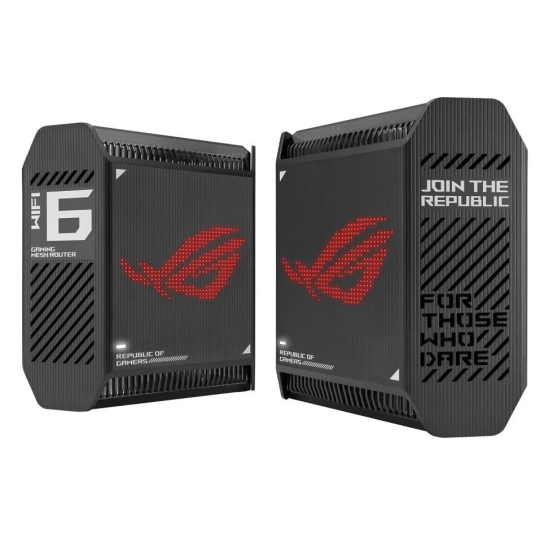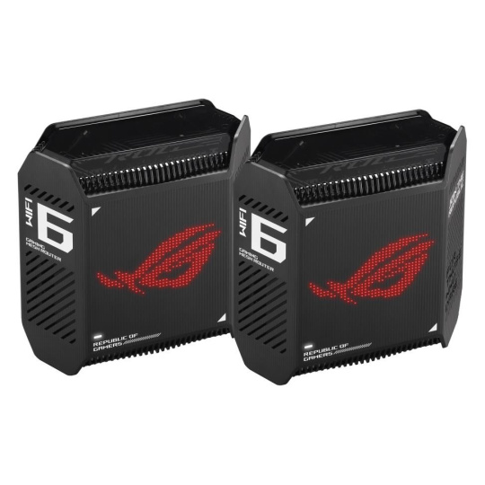 ROG Rapture Wifi 6 802.11ax Tri-band Gigabit Gaming Mesh System Wifi 6 802.11ax 574Mbps (2.4G) Wifi 6 802.11ax 4804Mbps (5GHz-1) Wifi 6 802.11ax 4804Mbps (5GHz-2) Data rate: 10000Mbps Whole home mesh wifi system for large and multi-story homes Supports flexible SSID setting, wired inter-router connections OFDMA + MU-MIMO tech, 1024 QAM, 2.5G WAN port, Triple level Game Acceleration, Aura RGB lighting, AiProtection Pro, VPN Fusion, Instand Guard Adaptive QoS, Bandwidth control, AiMesh, ASUS Roter APP (ROG theme).
