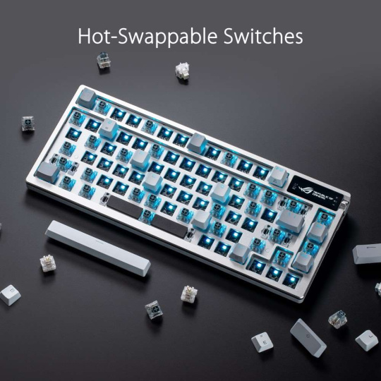 - Mechanické spínače ROG NX vyměnitelné za provozu: Předem namazané spínače pro hladší cvakání a eliminaci odskakování; rychlé ovládání a vyladěné křivky síly ROG poskytují skvělý pocit a konzistenci kláves