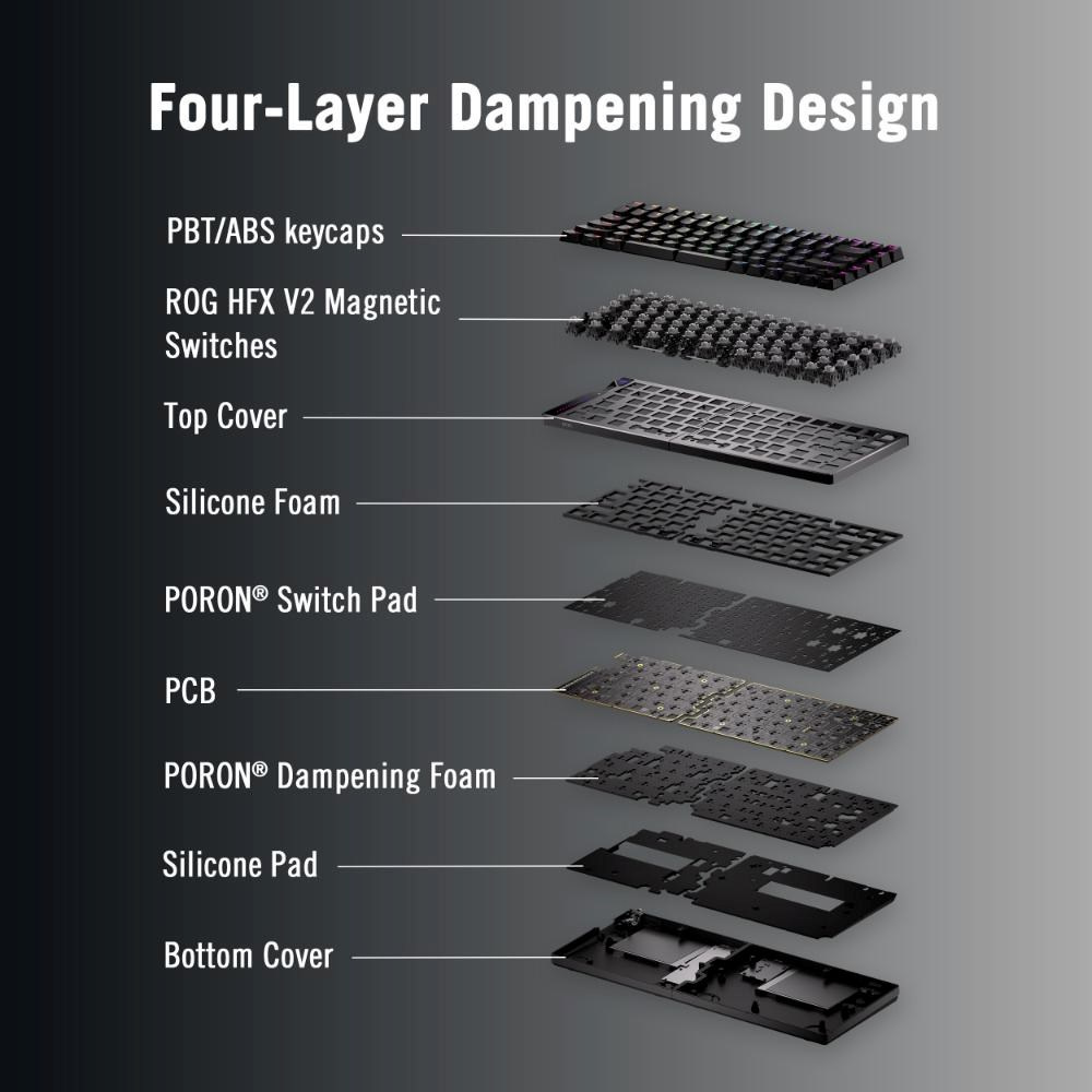 - Magnetický spínač ROG HFX V2 s možností výměny za provozu: Vylepšené stisky kláves s přizpůsobitelnou aktivací 0,1–3,5 mm a přesným laděním v krocích po 0,01 mm