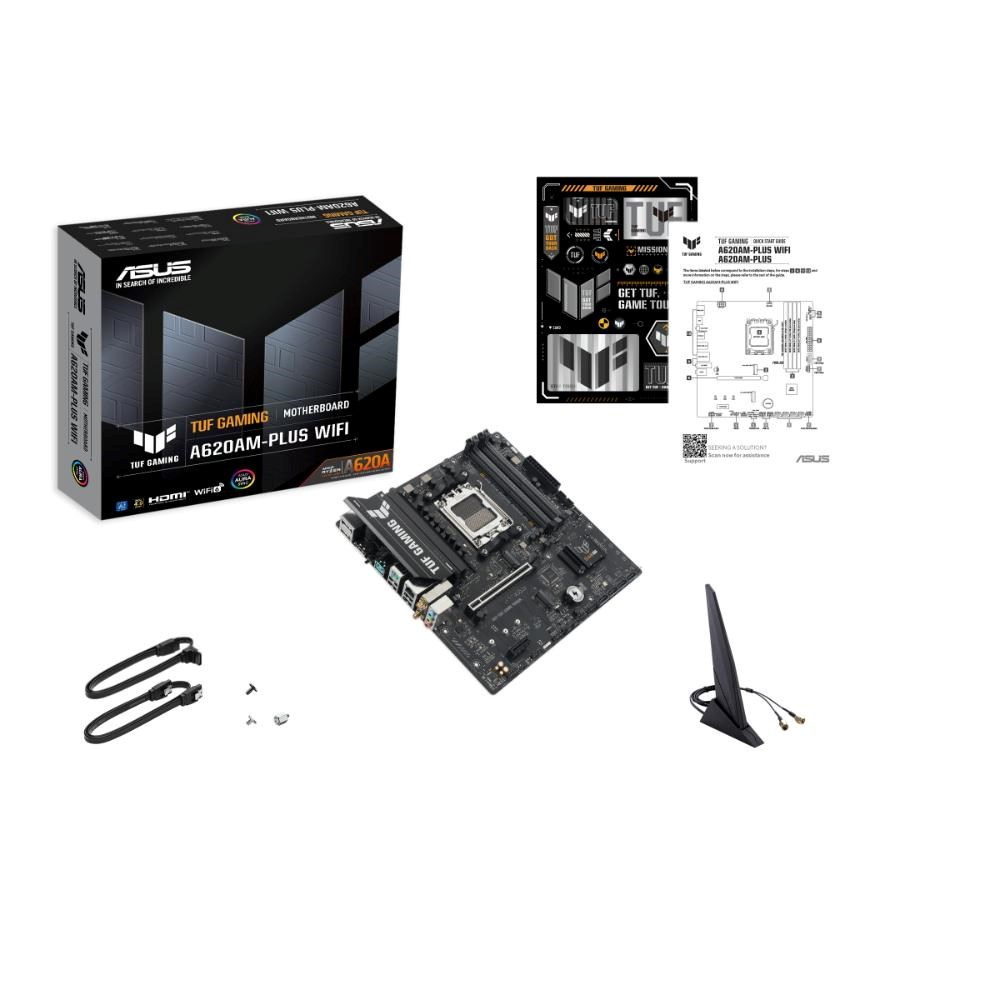 ASUS TUF GAMING A620AM-PLUS WIFI takes all the essential elements of the latest AMD Ryzen™ processors and combines them with game-ready features and proven durability. Engineered with military-grade components, an upgraded power solution and a comprehensive cooling system, this motherboard goes beyond expectations with rock-solid and stable performance for marathon gaming. TUF GAMING motherboards also undergo rigorous endurance testing to ensure that they can handle conditions where others may fail. This platform delivers the power and connectivity that advanced AI PC applications demand.