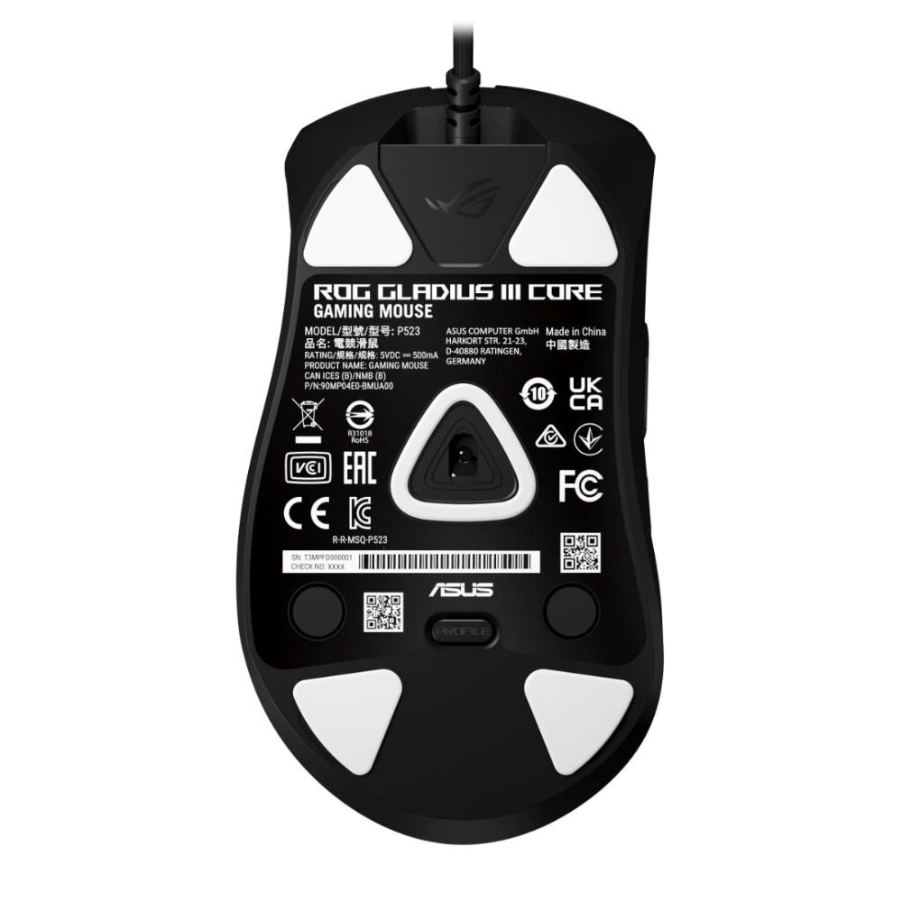 ROG Gladius III Core je 72gramová kabelová herní myš s ergonomickým tvarem, vybavená optickým senzorem s rozlišením 12 000 dpi, spínačem ROG Micro Switch II, zásuvkami ROG Push-Fit Switch Sockets, kabelem ROG Paracord a 100% PTFE podložkami.