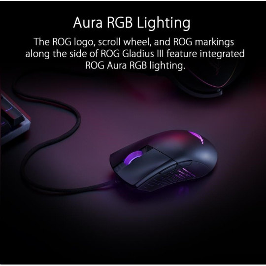 - Aura RGB Lighting - The ROG logo, scroll wheel, and ROG markings along the side of ROG Gladius III feature integrated ROG Aura RGB lighting. The laser-engraved side panel also features special flicker effects that can be customized with the color of your choice.