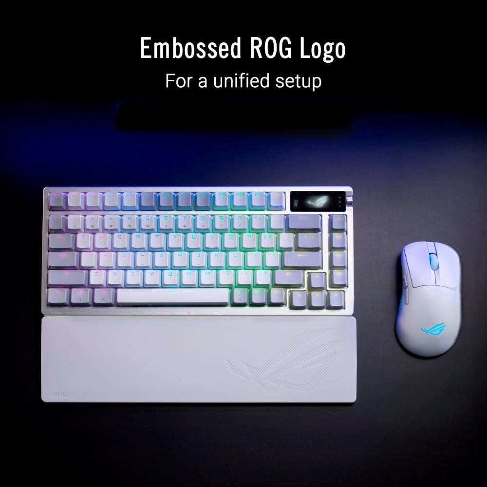 Herní opěrka zápěstí ROG s polstrovaným pěnovým jádrem pro ergonomickou podporu, měkkým povrchem z umělé kůže a protiskluzovými gumovými nožkami.
