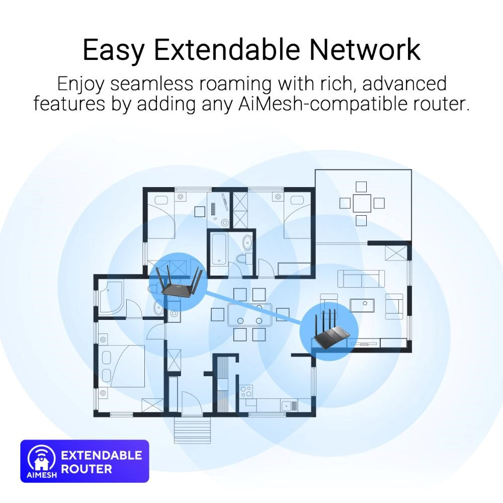 - Snadno rozšiřitelná síť - Vychutnejte si bezproblémový roaming s bohatými pokročilými funkcemi přidáním libovolného routeru kompatibilního s AiMesh.