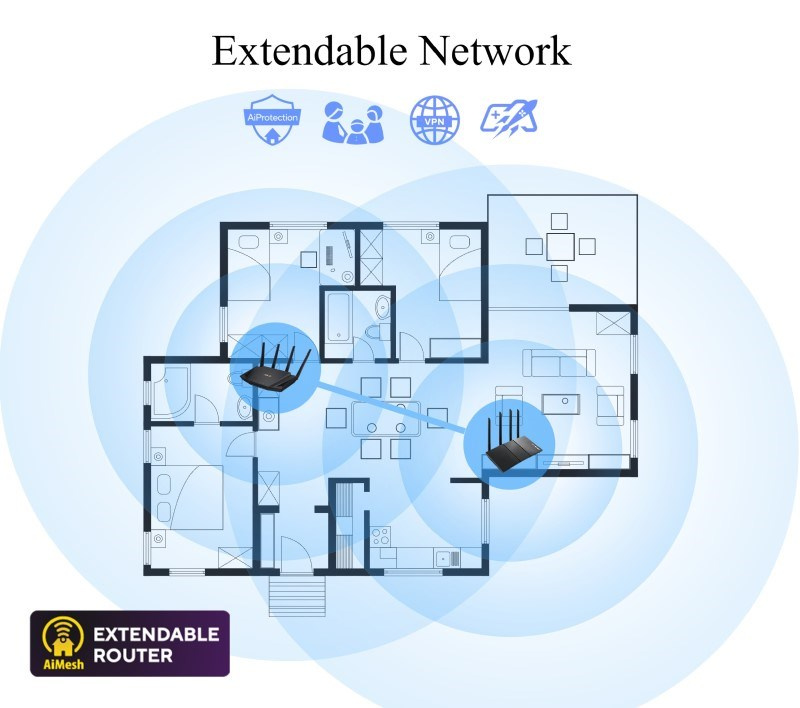 - Snadno rozšiřitelná síť - Vychutnejte si bezproblémový roaming s bohatými pokročilými funkcemi přidáním libovolného routeru kompatibilního s AiMesh.