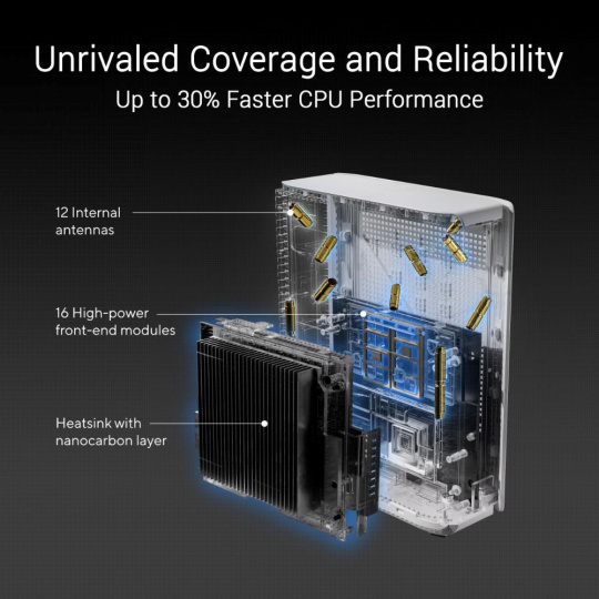- Dvanáct interních antén a šestnáct vysoce výkonných předních modulů eliminuje mrtvé zóny WiFi ve všech směrech, zatímco robustní rozptyl tepla zvyšuje spolehlivost WiFi.