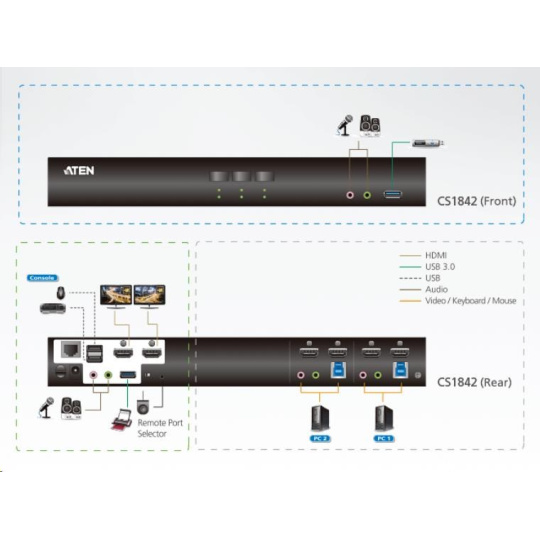 Přepínač KVM ATEN CS1942DP pomáhá organizovat pracovní plochu. Zvláště při správě multimediální pracovní stanice ve velké organizaci nabízí CS1942DP uživatelům okamžitý přístup ke dvěma počítačům,