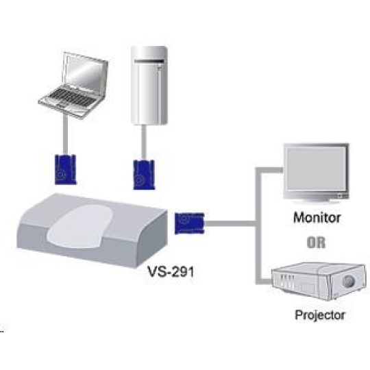 ATEN Elektronický VGA přepínač 2:1 - stolní Aten VS-291 je video přepínač se 2 porty VGA, který umožní připojit až 2 počítače k jednomu monitoru VGA. Toto řešení ušetří použití 1 monitoru a zpřístupní na jednom monitoru až 2 počítače. Zařízení se přepíná tlačítkem. - výběr zdroje signálu pomocí tlačítka na přepínači - elektronické přepínání - rozlišení až 1920x1440@60Hz - VGA, XGA, SVGA, UXGA, Multisync - zesiluje VGA signál do 10m - power save mod při vypnutém PC - až 10m vzdálenost kabelů bez ztráty kvality signálu - aktivní prvek, včetně napájecího adaptéru - DDC, DDC2, DDC2B Compatible. - multiplatformní podpora Windows/Linux/Mac a Sun konektory vstup 15pin HDB 2x Female výstup 15pin HDB 1x Female váha 150g rozměry 120x65x64mm V balení: 1x přepínač 1x napájecí zdroj 1x manuál.