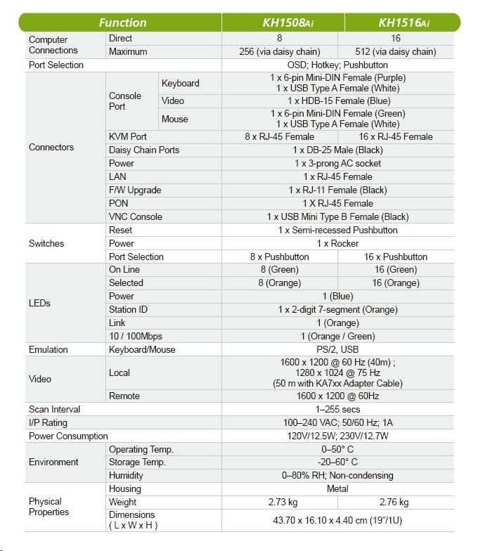 vzdálenost mezi PC a KVM může být 40m pro 1600 x 1200 @ 60Hz