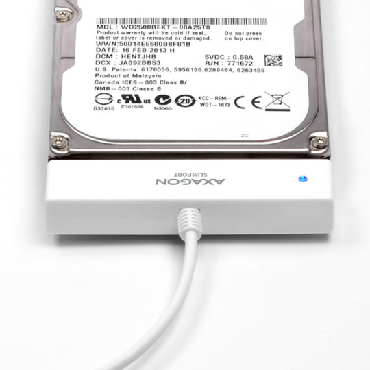 Kompaktní adaptér AXAGON ADSA-1S SLIMport s USB 2.0 rozhraním určený pro snadné připojení 2.5" SATA disku.