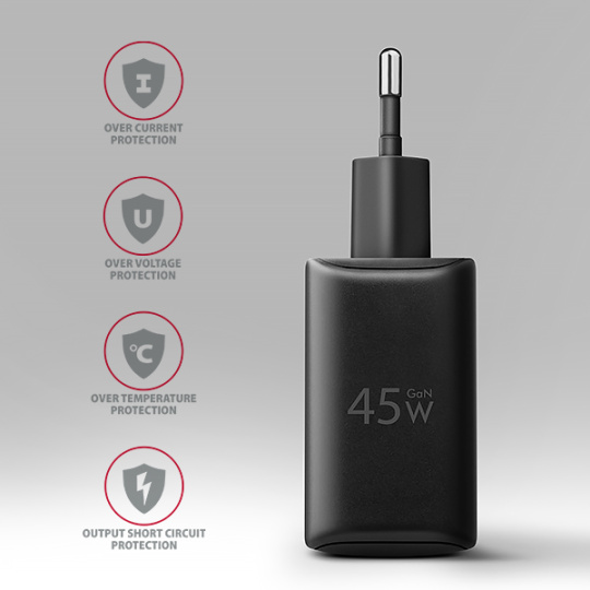 Kompaktní velikost a vysoký výkon je daný využitím nové GaN technologie. Použité součástky s Nitridem Galia pracují s vysokou účinností, což umožňuje dosahovat vysokých výkonů při malé velikosti. Nabíječka je vybavena výstupy Power Delivery 3.0 / Quick Charge 4+ USB typu C a Quick Charge 3.0 USB typu A, což umožňuje rychlé nabíjení nejen smartphonů a tabletů, ale také malých notebooků výkonem až 45W.