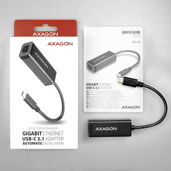 Kompaktní vysokorychlostní adapter AXAGON ADE-SRC snadno přemění USB-C 3.1 Gen 1 port na Gigabit Ethernet 10/100/1000Mbit port.