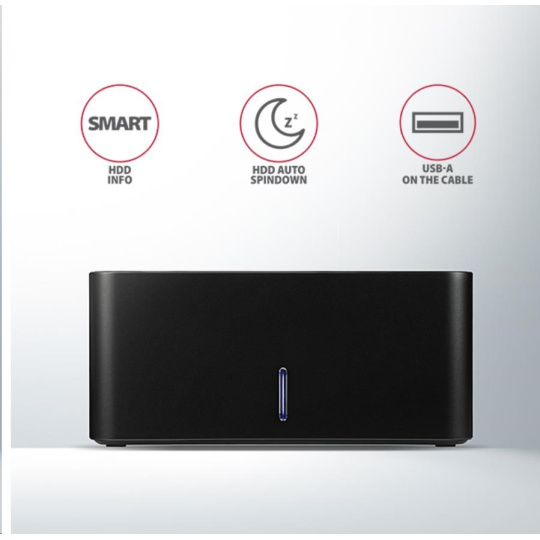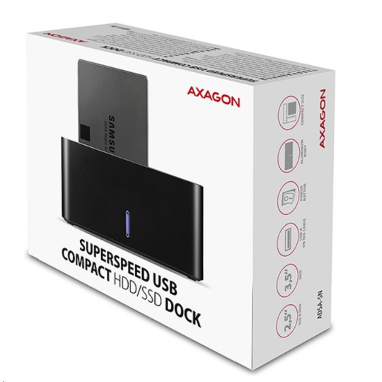 SuperSpeed USB dokovací stanice AXAGON ADSA-SN COMPACT HDD/SSD DOCK připojí k počítači snadno a rychle libovolný SATA disk.