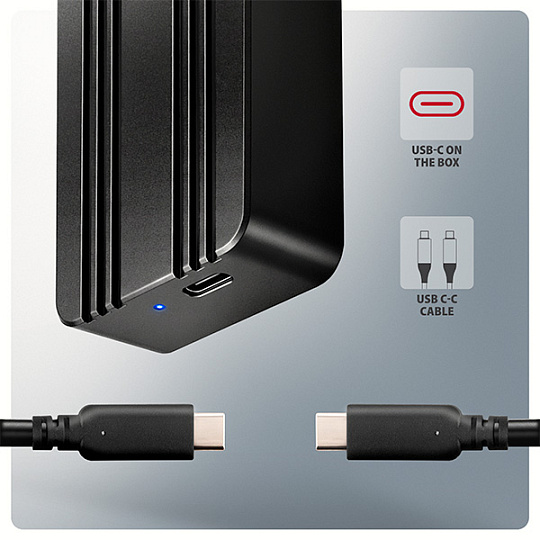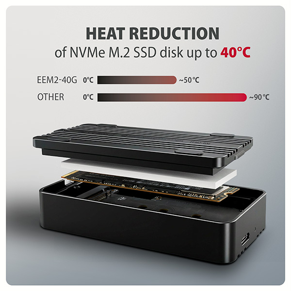 Box je určen pro M.2 NVMe SSD disky. Podporuje formáty 2230, 2242, 2260 a 2280 mm v jednostranném i oboustranném provedení, bez omezení kapacity (včetně disků s kapacitou 4 TB a vyšší). Podpora UASP napomáhá efektivnějšímu přenosu dat, zatímco funkce TRIM pomáhá udržet výkon SSD disku v průběhu času. Možnost čtení S.M.A.R.T. informací pak umožňuje sledovat stav disku.
